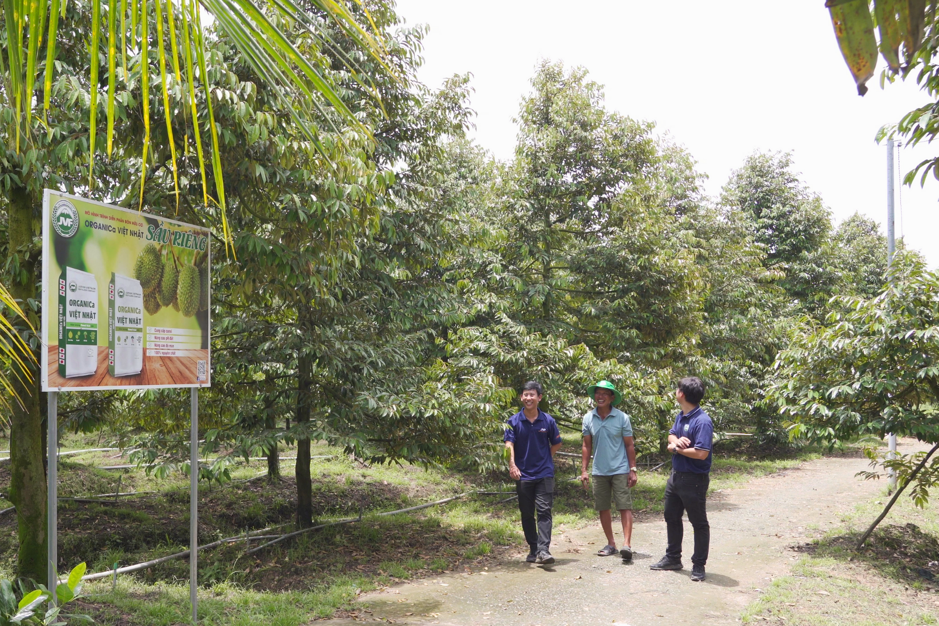 Hình 3: Anh Tám Hùng cùng cán bộ kỹ thuật của JVF thăm, kiểm tra vườn áp dụng phân bón hữu cơ Organica Việt Nhật